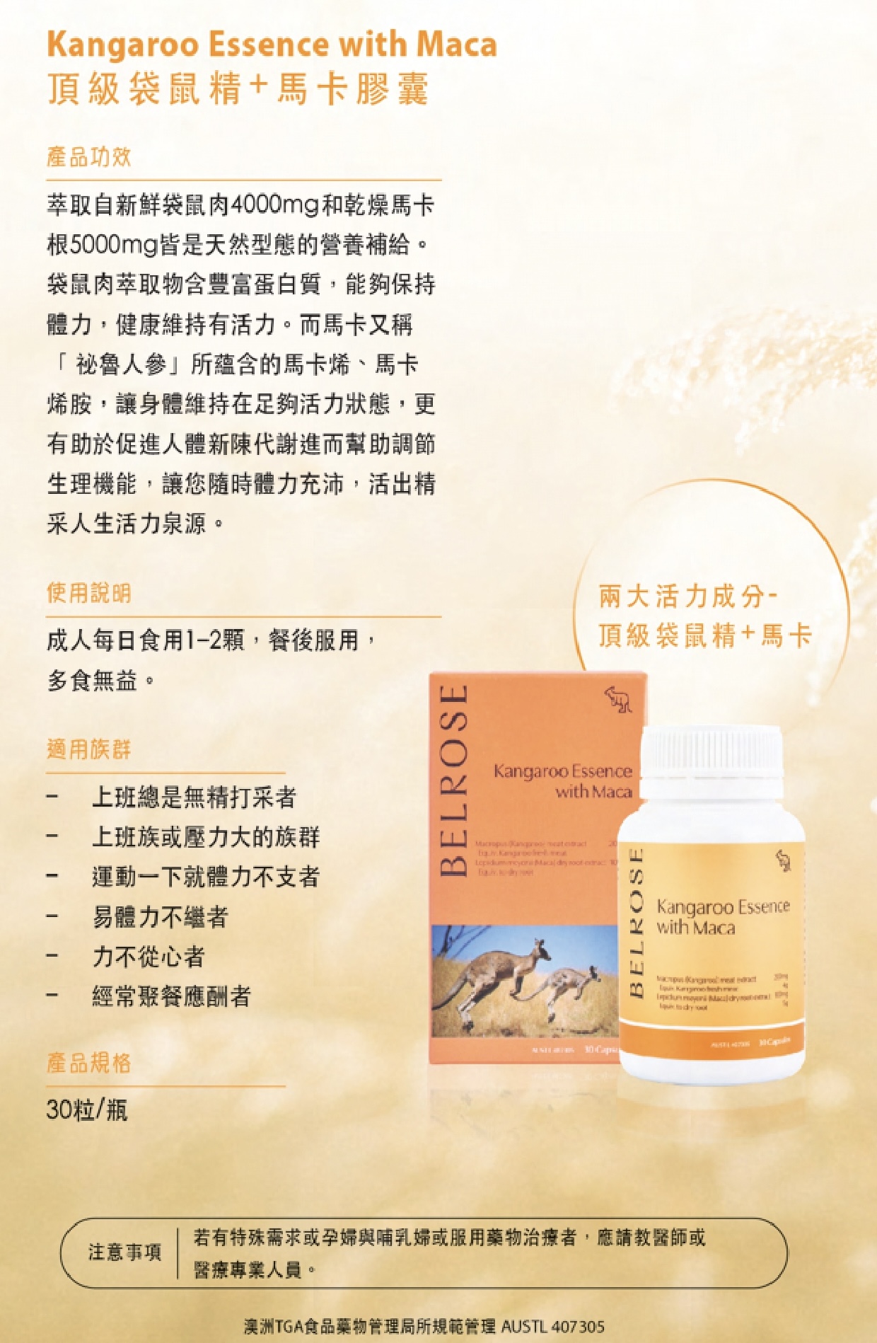 兩大活力成分-頂級袋鼠精+ 馬卡 可調整體質 增強體力 提供最佳活力來源